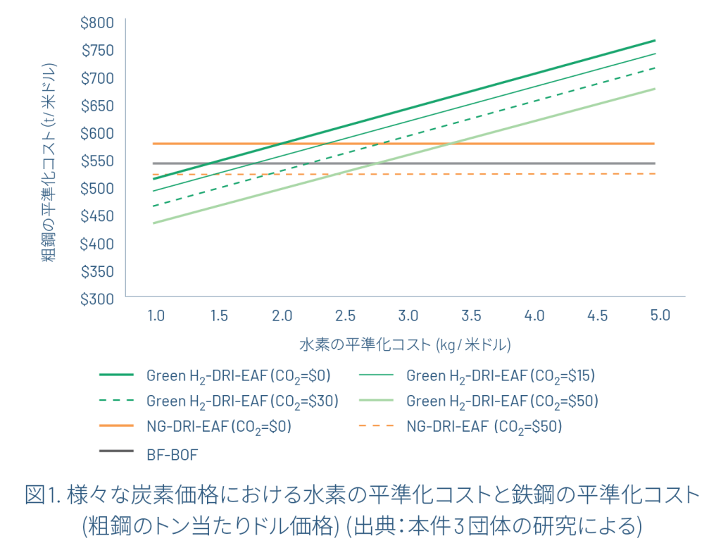 他方、カーボンプライシングを導入し、その炭素価格を15ドル/トンとすると、コストが均衡するポイントは変わってくる。この炭素価格で水素価格を1.0ドル/kgとした場合、グリーンH2-DRI-EAF法による生産コストは491ドル/トンで、BF-BOF法の539ドル/トンを下回り、グリーン鉄を採用するに十分な経済的インセンティブを示す。このコストメリットは炭素価格が30ドル/トンになるとさらに顕著になり、グリーンH2-DRI-EAF法のLCOSをBF-BOF法と均衡させようとすると、水素価格は2.2ドル/kgでよい。炭素価格が50ドル/トンに上昇すると、グリーンH2-DRI-EAF法の競争力はさらに高まり、水素価格が2.8ドル/kgを超える程度でもBF-BOF法と同等のコストになる。