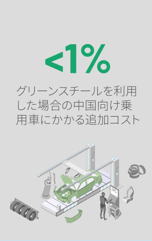 自動車産業が世界の鉄鋼需要に占める割合は12%で、グリーンH2-DRI-EAFスチールを使用することによる追加コストはグリーンプレミアムと呼ばれる。これについては様々な研究があり、自動車価格全体への影響は最小限であること、そして最も早くグリーンスチール調達に動くのは自動車産業であるとされる。中国の場合、水素価格が5ドル/kgと仮定すると、従来のBF-BOF法と比較して、H2-DRI-EAF法で生産された鋼材のグリーンプレミアムは約225ドル/トンになる。乗用車に使用される鋼材は平均0.9トンなので、乗用車1台あたりでは約203ドルの追加コストが発生することになるが、これは中国の乗用車平均価格(2万2,000ドル)に対して1%未満にとどまり、乗用車価格とマーケットの安定性は十分に維持できる。今後に関する予測では水素価格が1.4ドル/kgまで低下する可能性もあり、この場合グリーンプレミアムは事実上ゼロ、H2-DRI-EAF法によるグリーンスチールは従来法で生産された鉄鋼とコスト面ではほぼ同じポジションを占め得る。また、H2-DRI-EAFスチールのグリーンプレミアムは、カーボンプライシングやクレジットの導入によってさらに大幅に低下することもあり得る。