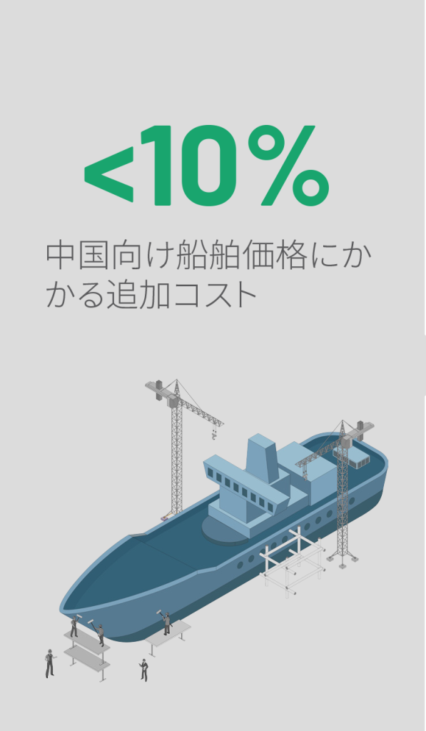 世界の造船業では、中国、韓国、日本の上位3カ国が90%以上のシェアを独占している。グリーンH2-DRI-EAF法による鉄鋼を造船に使用すると、コストはわずかではあるが上がる。世界には多くの船種があるが、今回の研究では世界中で毎年大量に造られているばら積み船に焦点を絞る。例えば、平均的とされる載荷重量4万トン (40,000 DWT) のばら積み船を建造する場合、約13,200トンの鋼材が必要となる。グリーンH2-DRI-EAF法による鉄鋼を水素価格5ドル/kgとして中国でこの種の船を建造したとすると、追加コストは1隻あたり約300万米ドルとなる。載貨重量4万トンのばら積み船を新造するコストが平均3,000万ドル以上であることを踏まえると、グリーンスチールプレミアムは総コストの10%以下にとどまる。