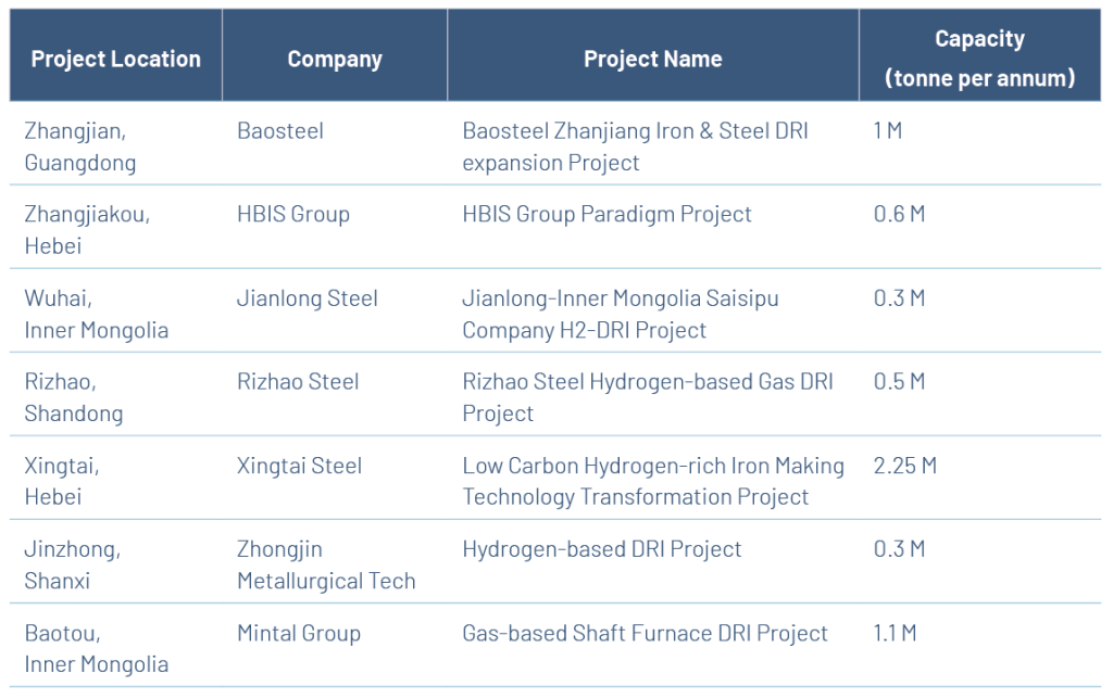 中國大部份的直接還原鐵項目位於北部省份,環繞北京的地區。這些省份是中國的鋼鐵生產核心地帶,其中河北、江蘇、山東、河南和安徽五省佔中國粗鋼產量的60%以上。值得注意的是,內蒙古自治區也是兩個氫基直接還原鐵項目工廠的所在地。近年來,這個傳統上以煤炭為主的地區,由於風能和太陽能的高潛力,已成為可再生電力項目的熱點。