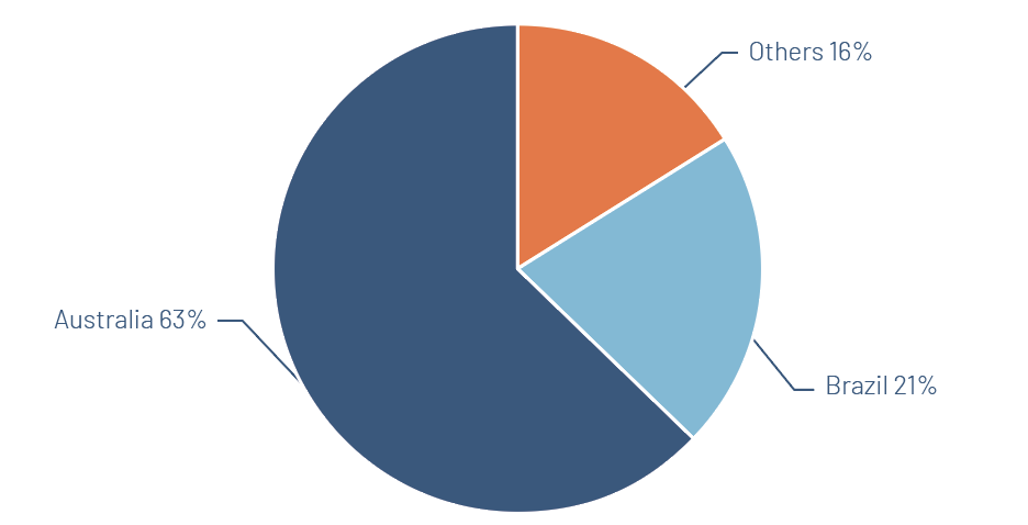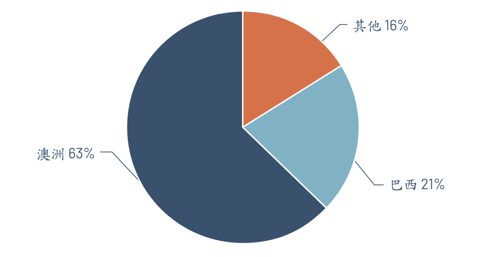 中國的鐵礦石格局主要以高爐級鐵礦石為主,其鐵含量約為62%。由於國內可用的鐵礦石品位較低(約34.5%的鐵含量),中國約有80%的鐵礦石依賴進口。2023年,進口鐵礦石主要來自澳洲(63%)和巴西(21%),其餘16%則來自印度和南非等國家。25