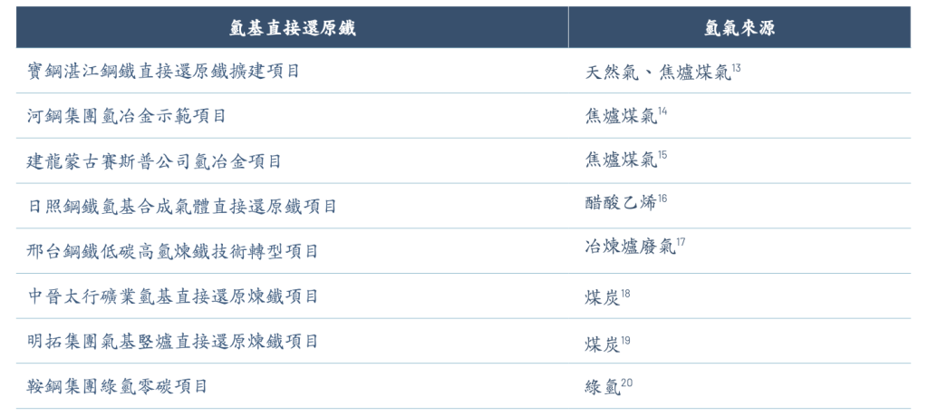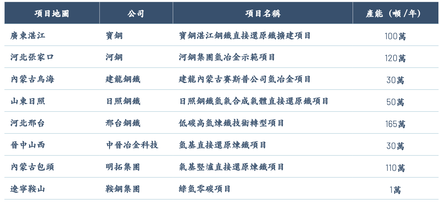 以上圖表引用了多個來源,概述了寶鋼在廣東湛江的大型鋼鐵廠、河鋼集團在河北張家口的氫基直接還原鐵項目、以及建龍鋼鐵在內蒙古烏海的項目等重要項目的關鍵細節。12此外,山東日照的日照鋼鐵、河北邢台的邢台鋼鐵和山西晉中的中晉太行礦業公司也在中國不斷發展的鋼鐵生產格局中貢獻力量。該表格提供了這些H2-DRI項目的概覽及其年度產能。