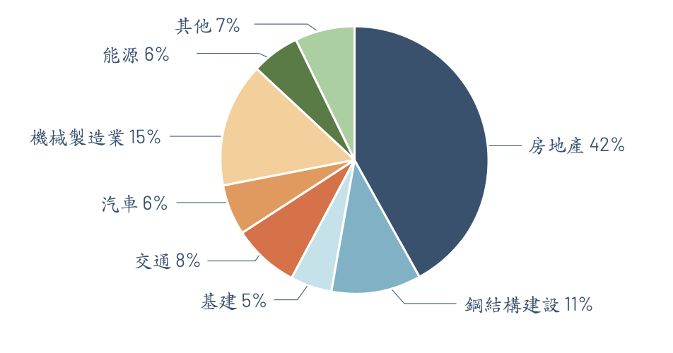 從宏觀角度來看,鋼鐵行業的前景將進一步受到抑制。中國的疫情後經濟復甦速度慢於預期,對鋼鐵產業帶來了挑戰。中國房地產業是鋼鐵的主要消費者之一,由於主要房地產公司的財務困境,目前正面臨重大阻力。部分企業面臨破產風險,其他企業則掙扎於違約風險或利潤損失,導致房地產行業對鋼鐵的需求大幅下降。46 該行業在2022年占中國鋼鐵總消費量的42%。47