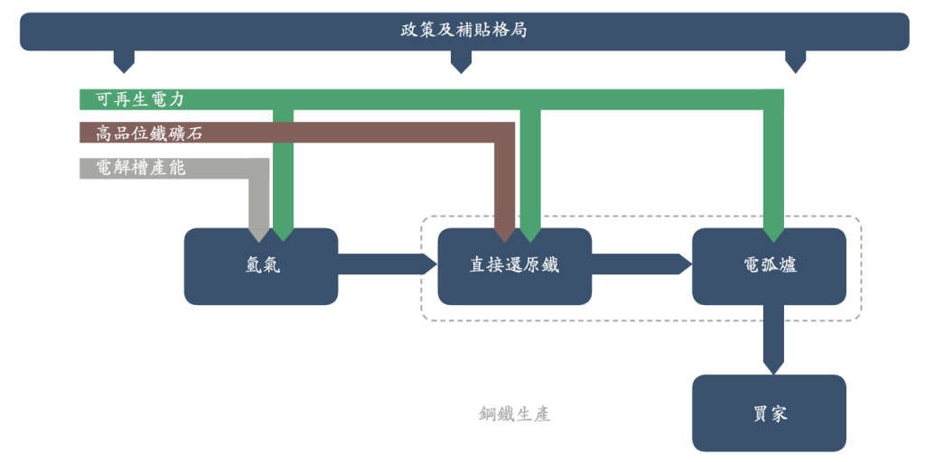 圖1: 氫基直接還原鐵-電弧爐(H2-DRI-EAF)或綠色初級鋼鐵的組成部分