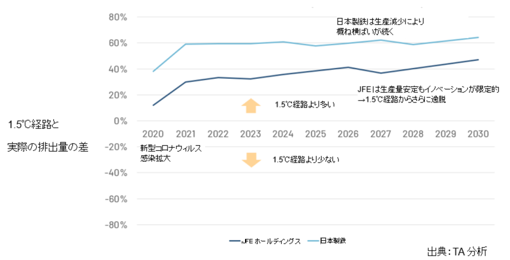 両社とも、2030年に向けて気候に関する意欲と行動を強化する必要がある。重要なのは、この経路が2010年を基準年とした排出削減量を用いていることである。両社とも2013年を基準年としているが、この年は鉄鋼生産が例年になく多かったため、結果として排出削減量が多くなっているに過ぎない。2010年の排出量と比較すると、2030年までの排出削減量は極めて不十分である。