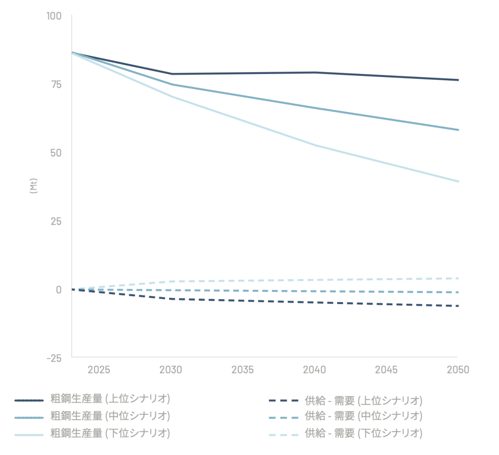 - 2019年度の粗鋼生産量(9840万トン)を基にに行われた日鉄総研の予測によると、2050年の粗鋼生産量は4190万~9050万トンの範囲となり、スクラップ不足は400万~1100万トンに達すると見込まれている。しかし、粗鋼生産量はすでに2023年度には8680万トンまで減少している。https://www.meti.go.jp/meti_lib/report/2021FY/000080.pdf