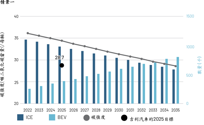 我們的分析顯示,按照情景一,則吉利汽車將不能完成2025年的減排目標, 目標要到2035年才能實現,原因是2025年的碳強度預計會保持在每輛汽車排出超過30噸二氧化碳當量(tCO2e),較預期減排軌跡落後58%。