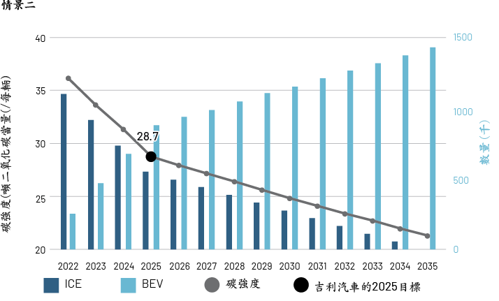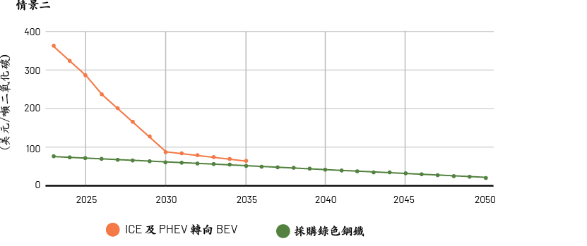 情景二:吉利汽車於2035年以前急速淘汰內燃引擎(ICE)汽車和插電式混 合動力電動汽車(PHEV)以符合其2025年目標和歐盟在2035年禁止內燃引 擎汽車的政策, 同時跟據鋼業零排放(Steel Zero)建議採購綠色鋼鐵。