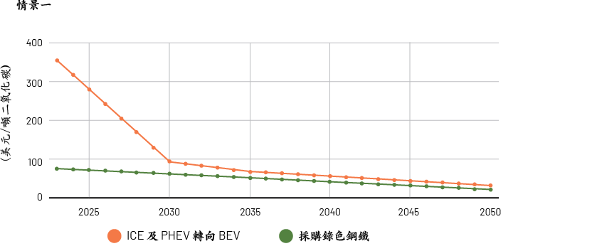情景一:吉利汽車逐步將其生產的ICE汽車和插電式混合動力電動汽車 (PHEV),在2050年以前直線式轉換為BEV,同時跟據鋼業零排放(Steel Zero)建議採購綠色鋼鐵。