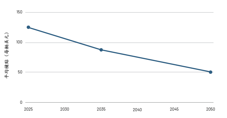 對於採購透過廢鋼電弧爐(Scrap EAF)或氫氣直接還原鐵-電弧爐(H2-DRI- EAF)方法生產的錄色鋼鐵,其能源及氫氣均以再生能源生產,政府需提供的 補貼會相對較低,估計到2025年每輛車約126美元,到2035年每輛車為88美 元。於2050年以前,由於綠色鋼材價格下降,平均綠色鋼材補貼亦將下降至較低水平的每輛50美元