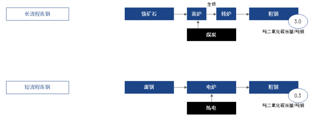 • 目前的钢铁生产以高炉和电弧炉 (简称电炉) 为主。高炉的碳排放量在以铁矿石为主要原料的钢铁生产流程 (通称长流程) 中占主导地位,但高炉和电炉都依赖化石燃料来提供热量和电力。