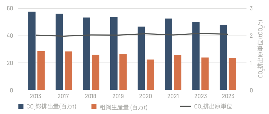 JFEホールディングスが掲げる2030年・2050年目標に鑑みると、2024年には排出量を2013年比で18%減の4,760万tCO2に削減する必要があるが、同社はこれに向けて着実に前進している。ただ留意すべきは、これまでの排出量削減は主に生産量の削減によるものであり、排出原単位は2013年以降大きく変わっていない点である。むしろ2013年に比べて排出原単位がわずかながら上昇したため、我々の分析では、この期間にみられた排出削減に対して109%が生産量の減少によるものであり、排出原単位の上昇は全体の削減量に9%の負の影響を与えたことが示された。少なくとも過去10年間、脱炭素対策がJFEホールディングスの事業活動において欠落していたこと、また鉄鋼生産量の削減が唯一の排出量削減手段であったことを示唆するものである。