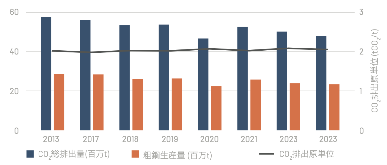 図 1: JFEホールディングスの年間生産量と排出総量推移