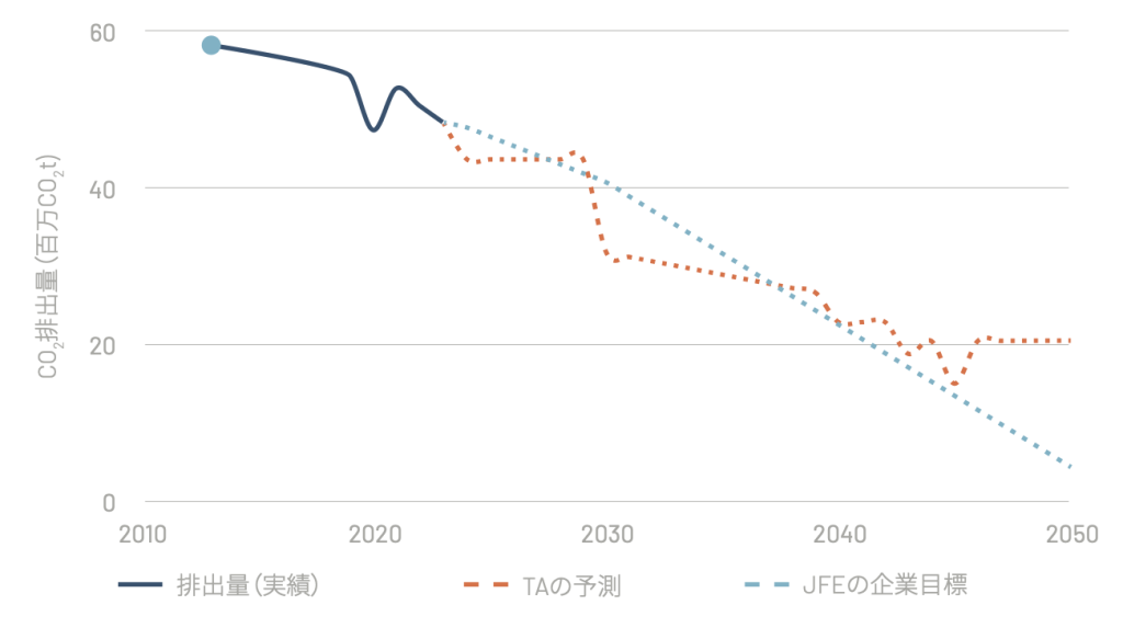 図 2: JFEホールディングスの製鉄事業と排出シナリオの比較(非連結):JFEホールディングスの企業目標とTransition Asiaによる2050年までの将来予測