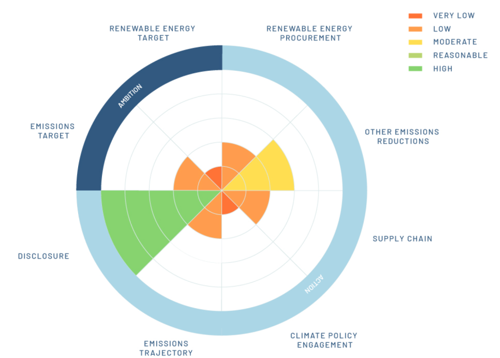 新しい目標は、気候変動に関する政府間パネル(IPCC)が勧告した、気温の上昇を1.5℃以内に抑えるための値(1.5℃目標)を大きく下回っている[3]。競合他社の多くと比べても意欲的とは言えない値であり、送電網の脱炭素化に関するアクションが弱いことや、再生可能エネルギーの調達がたったの4.34%という、行動面での弱さを反映している [4]。こうした点はすべて、気候変動とコマーシャルリスクを懸念するステークホルダーの懸念を惹起するものである。