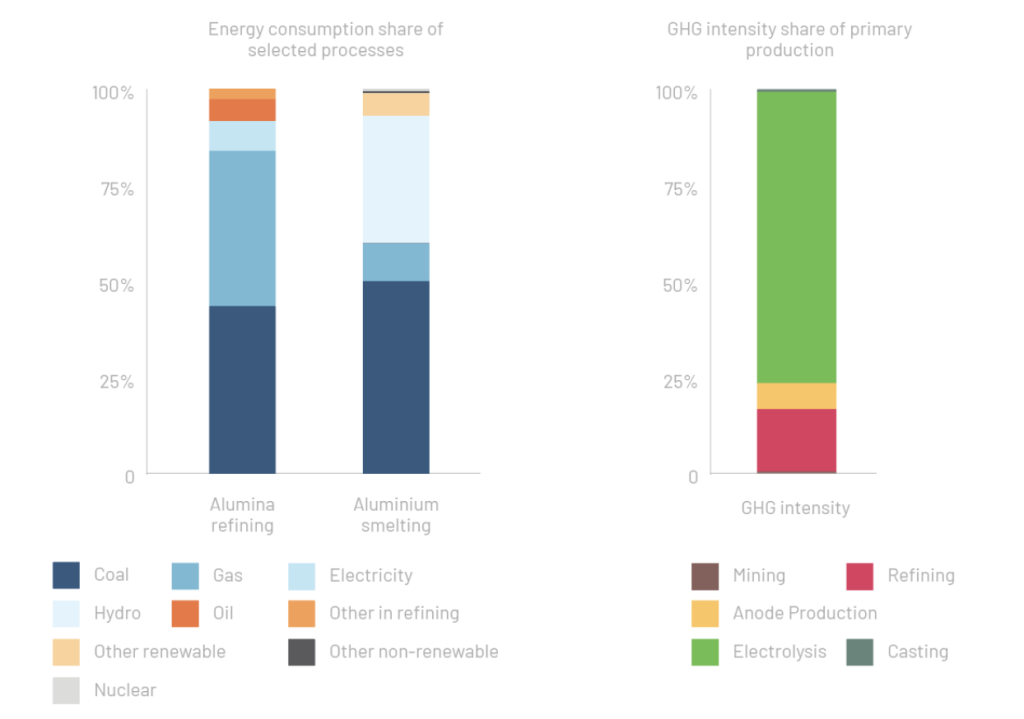 Figure 1. Share of energy consumption and GHG intensity of different stages in primary aluminium production