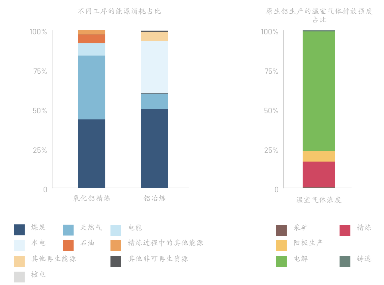 图1:原生铝生产各阶段的能源消耗占比与温室气体排放强度
