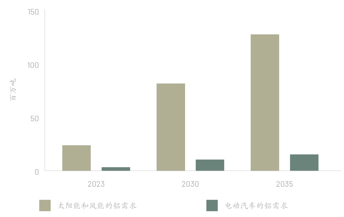 图2. 中国太阳能和电动汽车增长及相应铝需求,2023-2035
