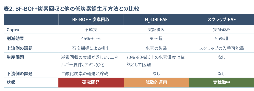 炭素回収技術による排出削減量が用途によって異なるのは当然で、炭素回収技術の回収率は、通常はCO2濃度が高い排出源に導入されたものの方が高くなる。他方、一般論としては、図1に挙げたIEEFAの分析が示すとおり、技術的・経済的な課題があり、炭素回収プロジェクトは期待される回収率を下回っている。このような背景から、鉄鋼業界では炭素回収技術の排出削減能力に対して弱気な見方が多い。