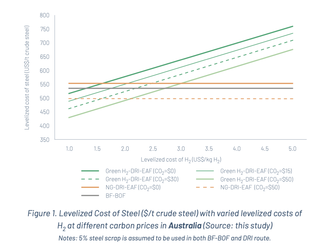 In Australia, without carbon pricing, green H2-DRI-EAF steelmaking costs start lower than traditional methods at $516 per ton for H2 at $1/kg, compared to $536 for BF-BOF. The cost-competitiveness of green H2-DRI-EAF diminishes as the H2 price increases with the cost parity with BF-BOF happening at $1.3/kg H2. The implementation of a $15 carbon price significantly enhances the economic viability of green steel. At a H2 price of $2/kg, and at $30 per ton of CO2, the LCOS for green H2-DRI-EAF further drops to $527 per ton, and at a $50 carbon price, it decreases to $493 per ton, which are lower than LCOS of $536 for BF-BOF in Australia.