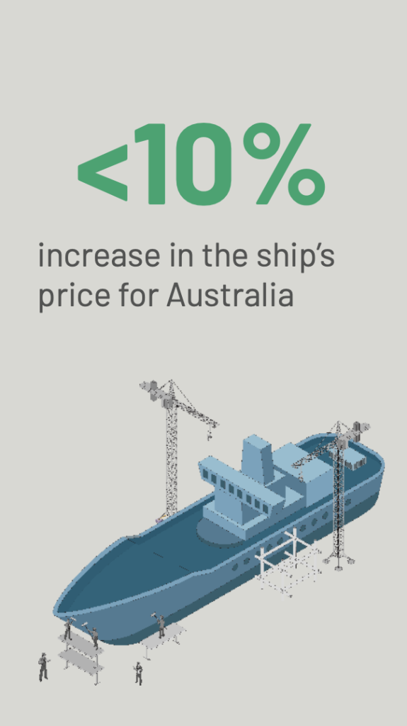 The top three shipbuilding nations, China, South Korea, and Japan, account for over 90% of global shipbuilding. Incorporating green H2-DRI-EAF steel into shipbuilding shows a small cost increase for ship building. While there are many types of ships in the global market. This study focused on bulk carrier ships which are built in large numbers every year around the world. For example, to build an average 40,000 DWT (Deadweight tonnage) bulk ship, approximately 13,200 tons of steel are needed. If green H2-DRI-EAF at $5/kg H2 is used in Australia to build this ship, the additional cost would be about$ 3 million per ship. Considering the average cost of a new 40,000 DWT bulk ship is over $30 million, this represents less than 10% increase in the ship’s price for Australia.