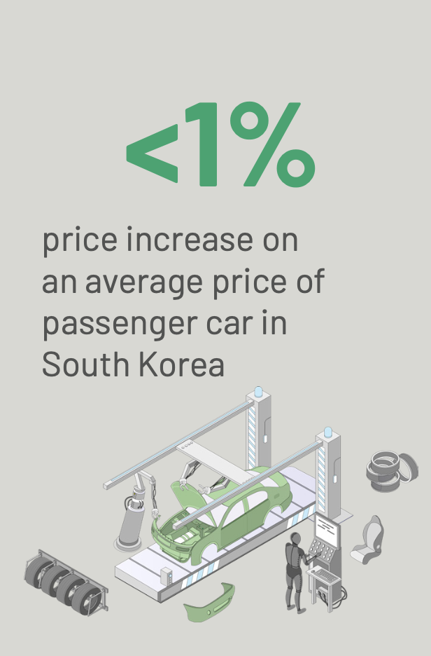 The automotive industry accounts for 12% of global steel demand. The additional cost attributed to using green H2-DRI-EAF steel in passenger vehicles—known as the green premium— is aligned with studies that estimated automotive sector as a likely first mover for green steel procurement and demonstrates minimal impact on overall vehicle pricing. For example, in South Korea, when the price of H2 is at $5/kg, the green premium for steel produced via green H2-DRI-EAF, compared to the traditional BF-BOF methods, stands at approximately $263 per ton steel. Assuming on average 0.9 ton of steel used in a passenger car, this translates to an additional cost of about $237 per passenger car, which represents a less than 1% price increase on an average price of passenger car in South Korea ($22,000), maintaining affordability and market stability. Future projections suggest that with H2 costs potentially reducing to below $1/kg, the green premium could effectively disappear, making green H2-DRI-EAF steel economically comparable to conventionally produced steel. With the introduction of carbon price/credit, the green premium for H2-DRI-EAF steel can substantially drop even further.