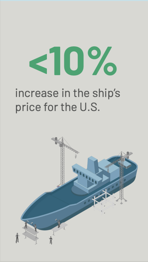 Incorporating green H2-DRI-EAF steel into shipbuilding shows a small cost increase for shipbuilding. While there are many types of ships in the global market. This study focused on bulk carrier ships which are built in large numbers every year around the world. For example, to build an average 40,000 DWT (Deadweight tonnage) bulk ship, approximately 13,200 tons of steel are needed. If green H2-DRI-EAF at $5/kg H2 is used in the U.S. to build this ship, the additional cost would be about $ 2.98 million per ship in the U.S.. Considering the average cost of a new 40,000 DWT bulk ship is over $30 million, this represents less than 10% increase in the ship’s price for the U.S..