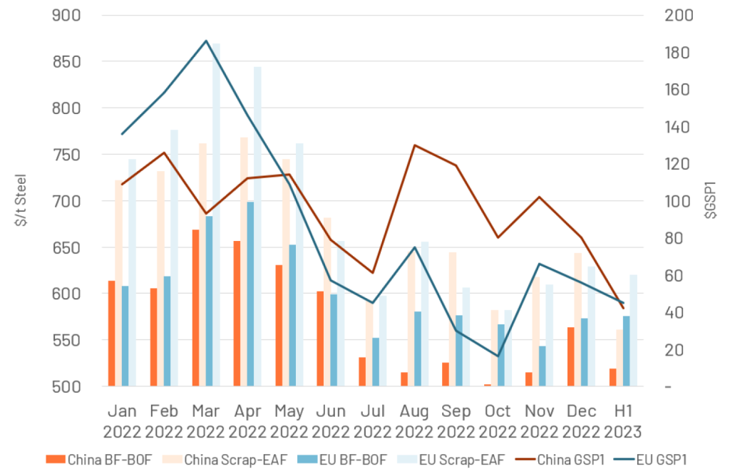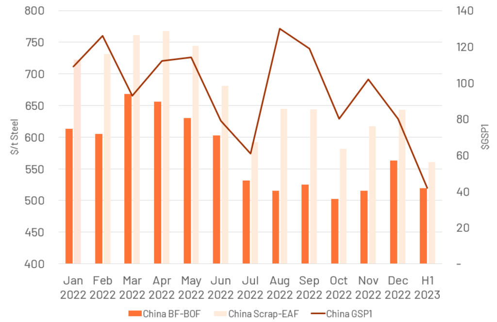 • China’s GSP1 was high in 2022 at around $100/t Steel and driven by high scrap prices; and