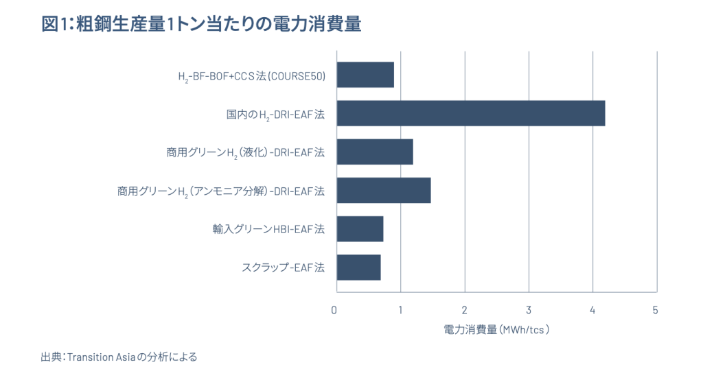 国内における製鉄に限ってみるならば、電力消費量が最少ですむのはグリーンなホットブリケットアイアン (HBI:Hot Briquetted Iron) や鉄スクラップをEAFに投入する方法で、その電力消費量は国内でH2-DRI-EAF法(水素直接還元鉄を鉄源とするEAF製鋼法)を利用した場合に必要な電力の約6分の1にとどまる。これはH2-DRI‐EAF法では必要なグリーン水素を生産するのに多量の電力を消費するためである。日本では電力の「系統制約」があるため、生産時の電力消費量を抑えられるスクラップとHBIを投入する方法は特に優れているといえる。他方、日本は成熟したスクラップ-EAF産業を有しながら、依然としてスクラップの純輸出国であり、スクラップの利用可能量の点でみれば、鉄鋼業界、特にスクラップを利用するEAFによる生産は今後も発展する可能性がある。また、一部鉄鋼メーカー (神戸製鋼所とJFE) は、グローバルサプライチェーンを通じたHBIの輸入プロジェクトをすでに開始している。このようなグローバルサプライチェーンの活用によって国内だけでなく世界的な視点からも脱炭素化が可能となり、例えば鉄鉱石からHBIへの加工など、電力消費量の多いプロセスを再エネ資源の豊富な国にアウトソースすることもオプションとなってくる。