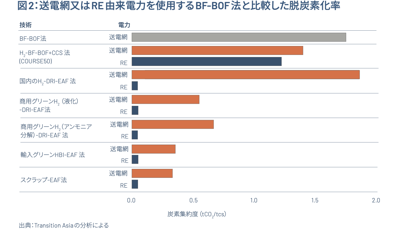 日本の鉄鋼生産拠点は、都市部周辺の沿岸地域に局在している。再エネによる自家発電はEAFの稼働に必要な電力を鉄鋼業界全体に供給できないので、実行可能な選択肢としてみなすことはできない。したがって日本の鉄鋼分野で脱炭素化を達成するには、電力系統を利用したソリューションを優先せざるを得ない。