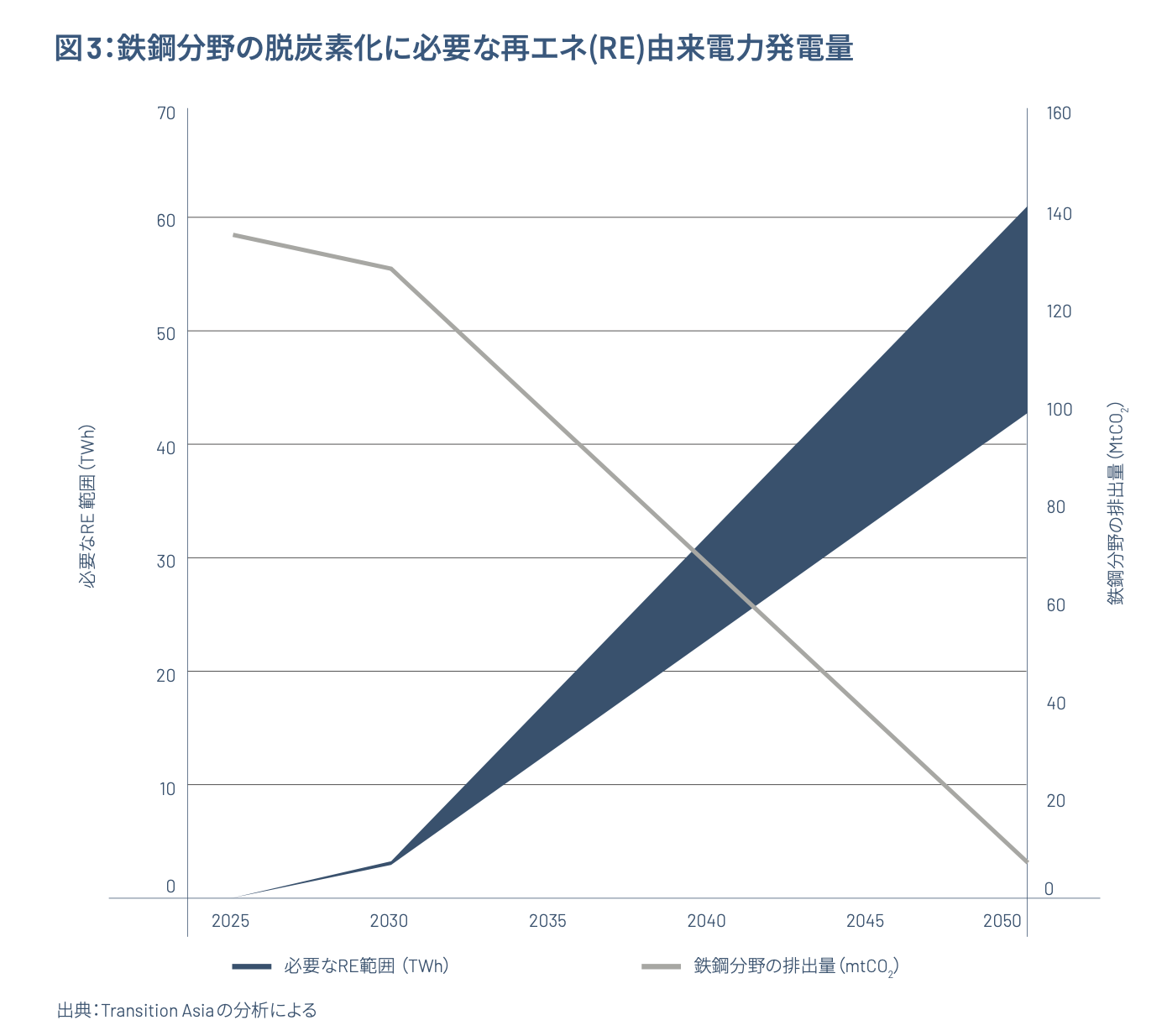鉄鋼メーカーがスクラップ-EAF法とグリーンHBI-EAF法向けの電力を確保する目的でCPPAを締結することが多くなれば、鉄鋼業界と電力分野の脱炭素化を同時に推進することが現実的に可能になる。日本の鉄鋼業界は2030年までに排出量を30%削減するという目標を掲げているが、この目標を達成するためにスクラップ-EAF法とグリーンHBI-EAF法を採用したとすると、590~600トン級EAF群が既存のBF-BOF設備を置き換えることになる (BF-BOF法による粗鋼生産量450万トン/年に相当)。このトランジションには再エネ由来電力が約3 TWh必要となる計算だが、これは日本における現在の発電量の0.5%未満にとどまる 。