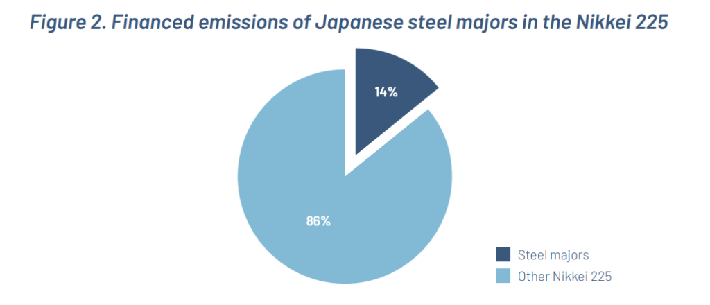 In fact, despite a lack of disclosure in Japan and the challenge of carbon accounting, we estimate that the Japanese steel majors (Nippon Steel, JFE and Kobe Steel) account for over 14% of the financed emissions of the Nikkei 225 and are all in the top 6 corporates when listed by highest financed emissions.