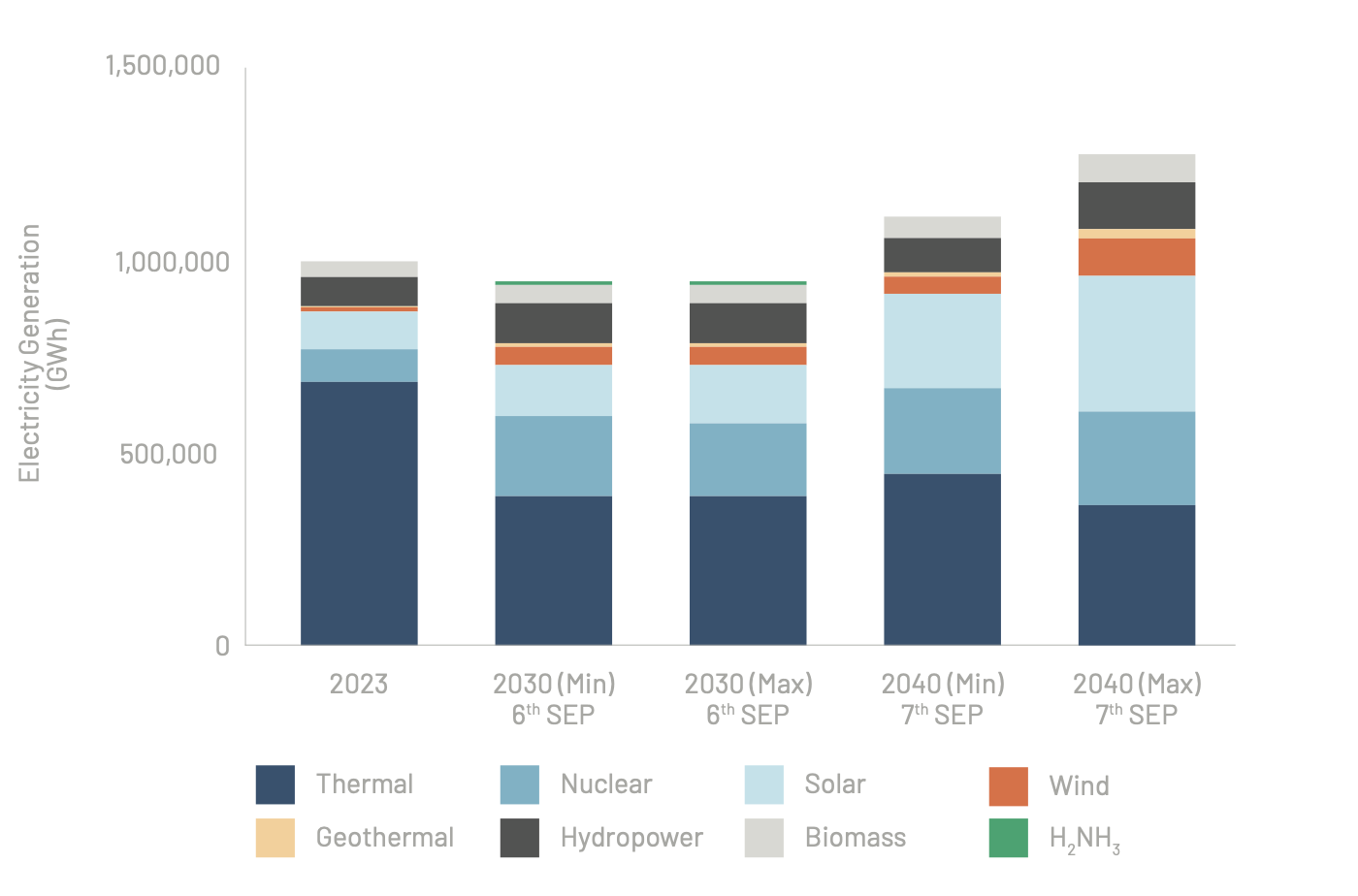 The 7th Strategic Energy Plan (7th SEP) which outlines the overall direction Japan will aim for in its energy policy was officially adopted by the Cabinet in February 2025. The key feature is the fact that RE is positioned as the top choice and dominant resource in Japan’s policy for the very first time in its history. The 7th SEP made a clear commitment to reduce its dependence on fossil fuels which accounts for over 70% in Japan’s energy mix. In the revised outlook for energy mix, fossil-fuel-based thermal power is projected to account for just 30-40% by 2040, while RE will become the largest source, making up 40-50%.