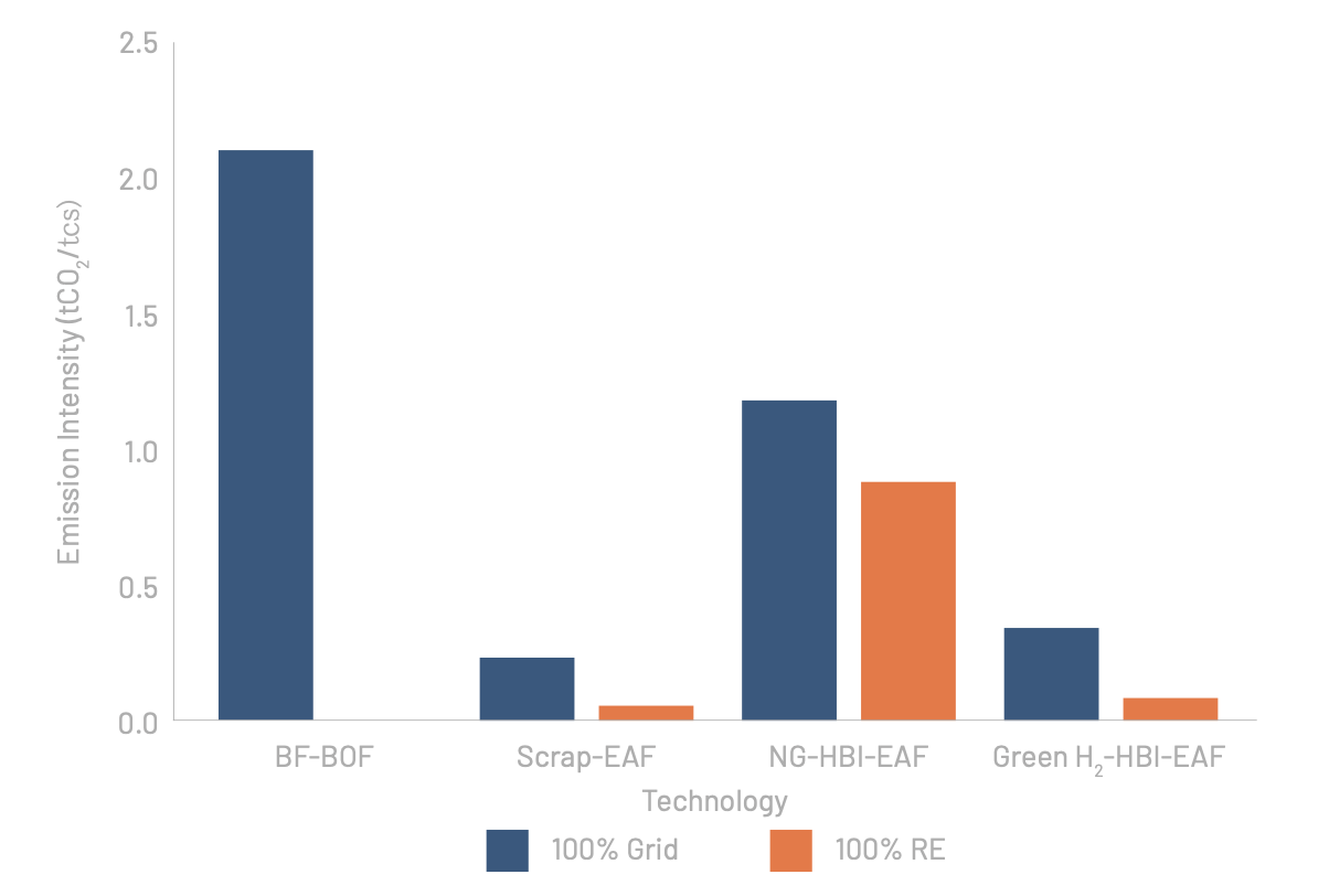 According to our research, EAF-based steel production emits significantly less carbon than conventional blast furnace methods—and emissions can be reduced even further if the furnaces are powered by 100% renewable electricity (See below figure). However, additional disclosure is needed to determine the announcement’s emissions reduction impact — particularly the energy sources powering these furnaces and the proportion of scrap and/or HBI (hot briquetted iron) they will use, which will have vast implications on the emission reduction impact. The carbon intensity of EAF operations varies significantly depending on whether they run on: