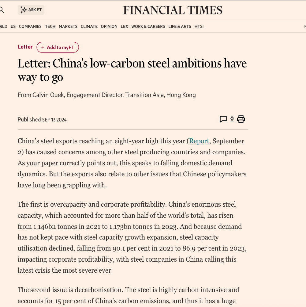 Calvin Quek Contributes to Financial Times Letter to the Editor on the Decarbonisation of China’s Steel Industry