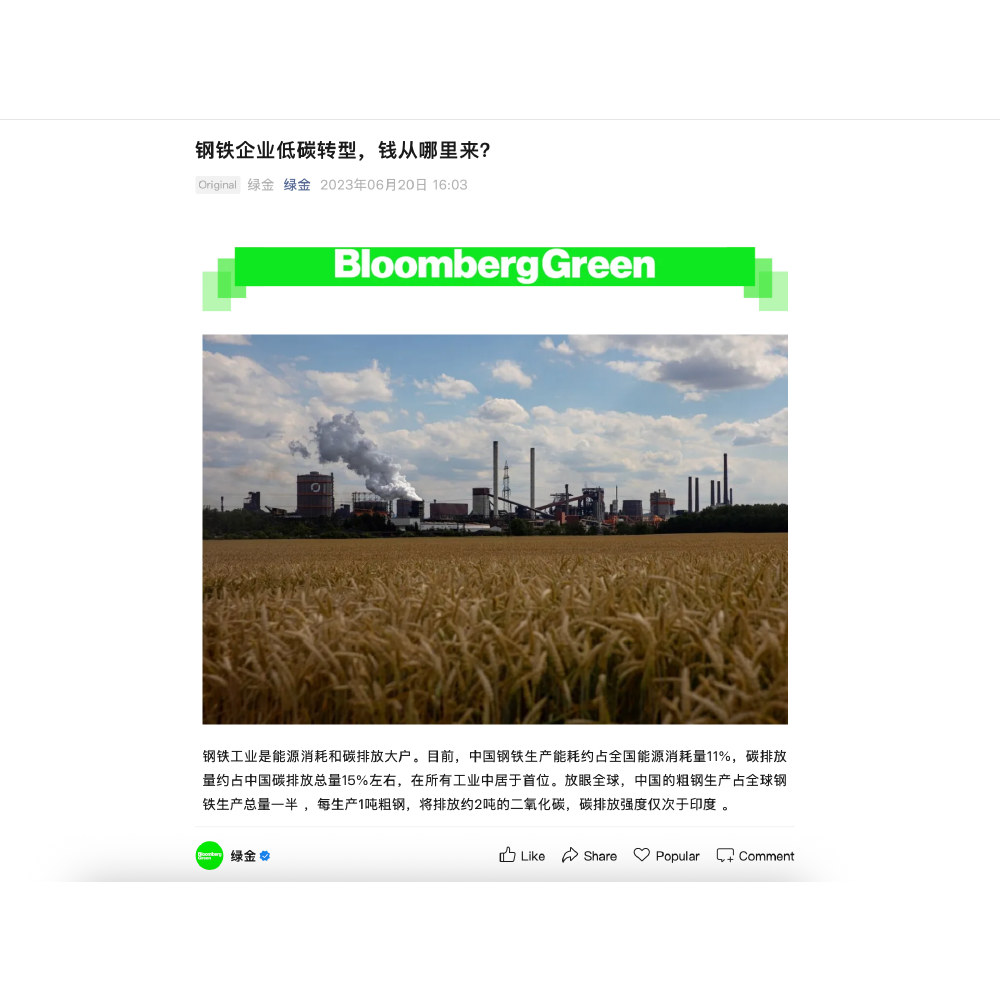 Our analyst writes for Bloomberg Green (Chinese version) on green finance options for Chinese steel sector