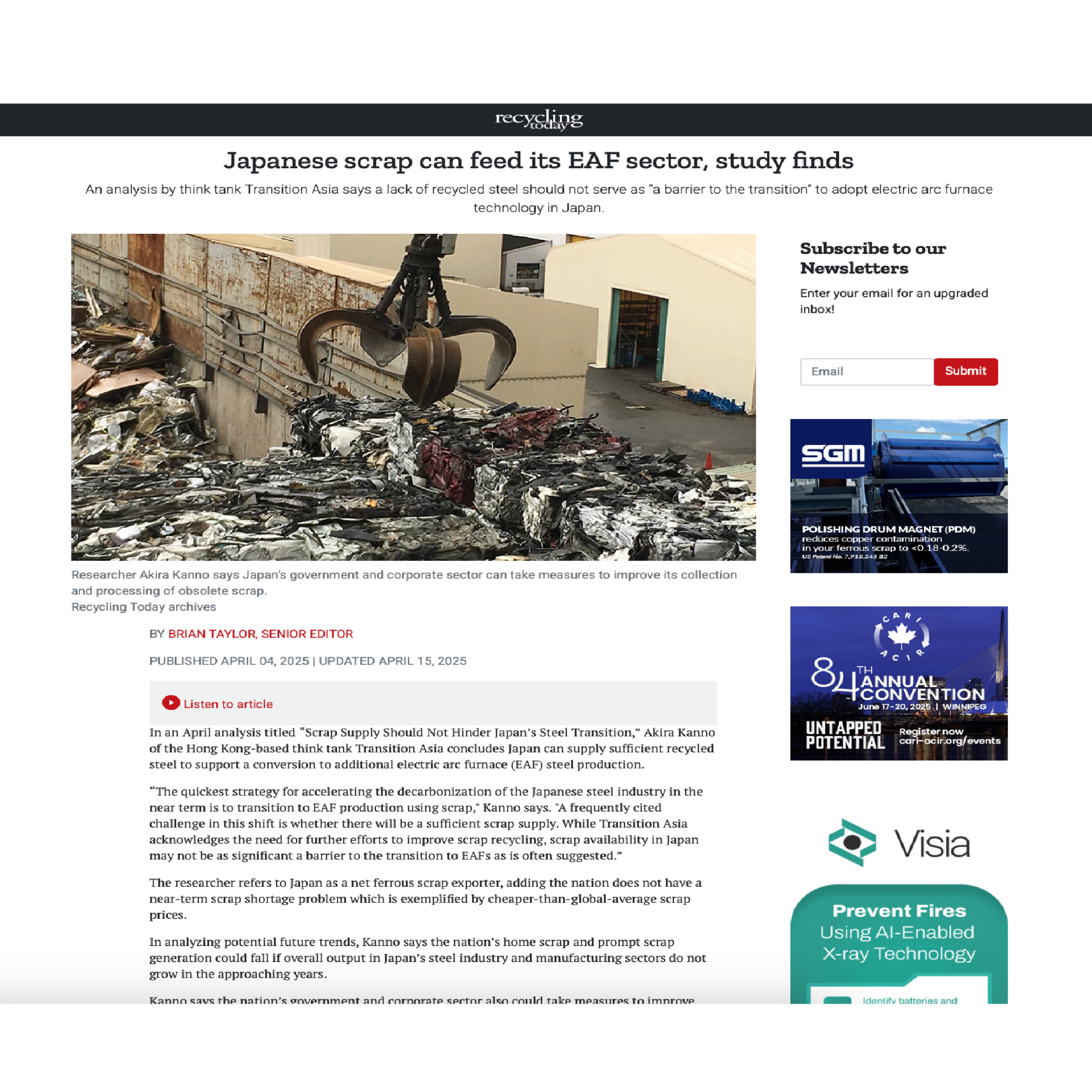 Akira Kanno is quoted in Recycling Today on Japanese scrap supply